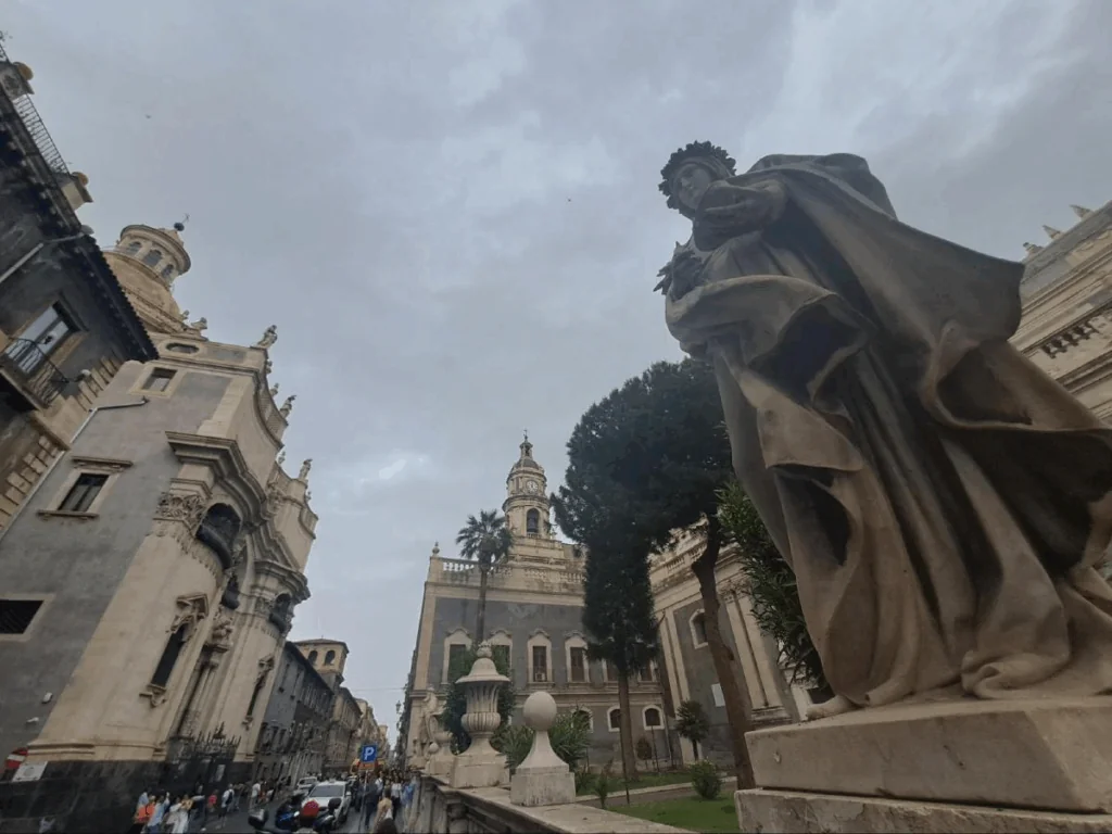 Katánie byla domovem mnoha italských umělců a vznikla zde také první sicilská univerzita. My máme jen hodinku a půl, a tak se náhodně touláme uličkami, abychom nasály atmosféru tohoto jedinečného města. A tak potkáváme třeba velkou mši, která se koná uvnitř i vně kostela (dění uvnitř je promítáno na velké obrazovky) a při vzpomínce na knihy Eleny Ferrante přemýšlíme, jaké jsou asi osudy přítomných Sicilanů. Baví mě kombinace modliteb, dětských her, žen na vysokých podpatcích a stařenek v šátku. Vzduchem se nese pach cigaretového kouře a výkřiky dětí, jež si hrají na honěnou, se mísí s vážnými slovy kněze. Atmosféra vskutku kouzelná a zvoucí k fantazírování.