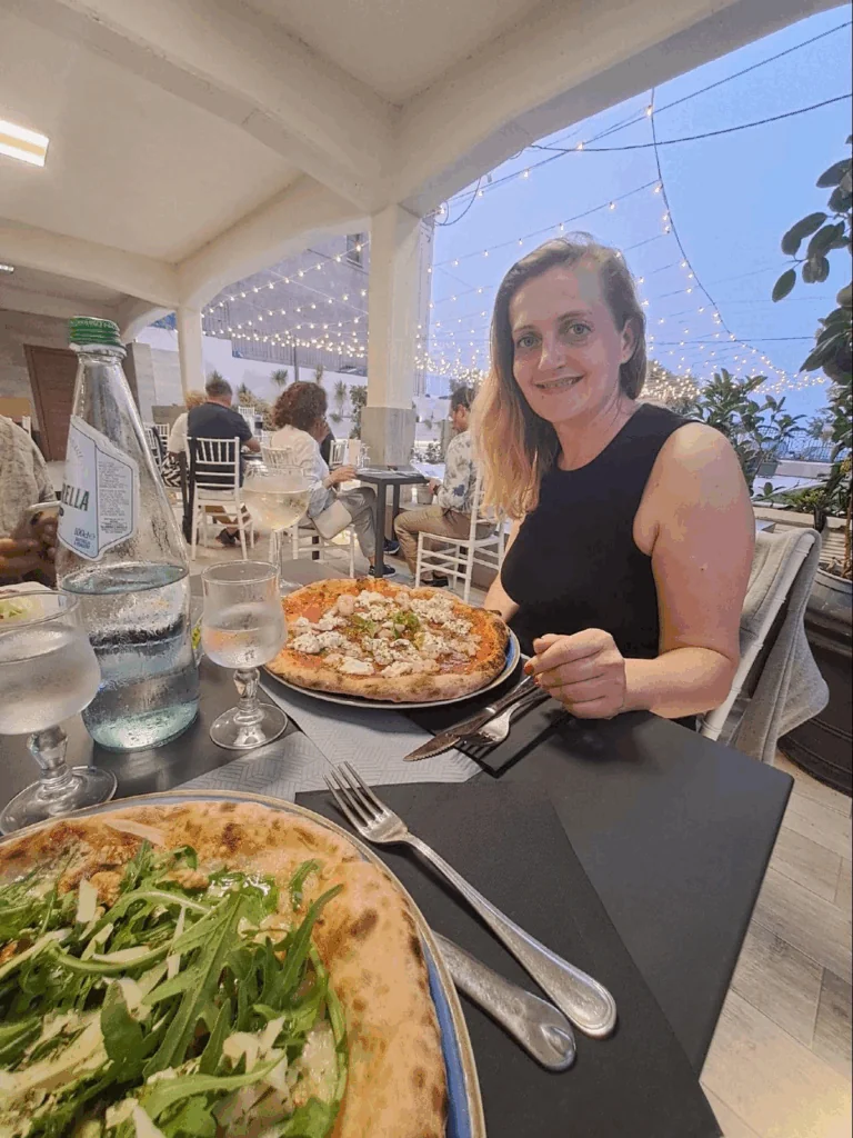 Od Virginie se dozvíme, že mají pro nás na zítřek připravený kulinářský program, abychom ochutnali co nejvíce sicilských specialit. Dnes si aspoň dáme pravou italskou pizzu, nad kterou si povídáme o tom, co přivedlo Virginii do Čech a pak na Sicílii. Při večerní procházce/projížďce kolem moře se ještě seznámíme s bláznivým psem Milem, jehož Virginii adoptovala z útulku na Guadelupu, a taky s její kočkou.