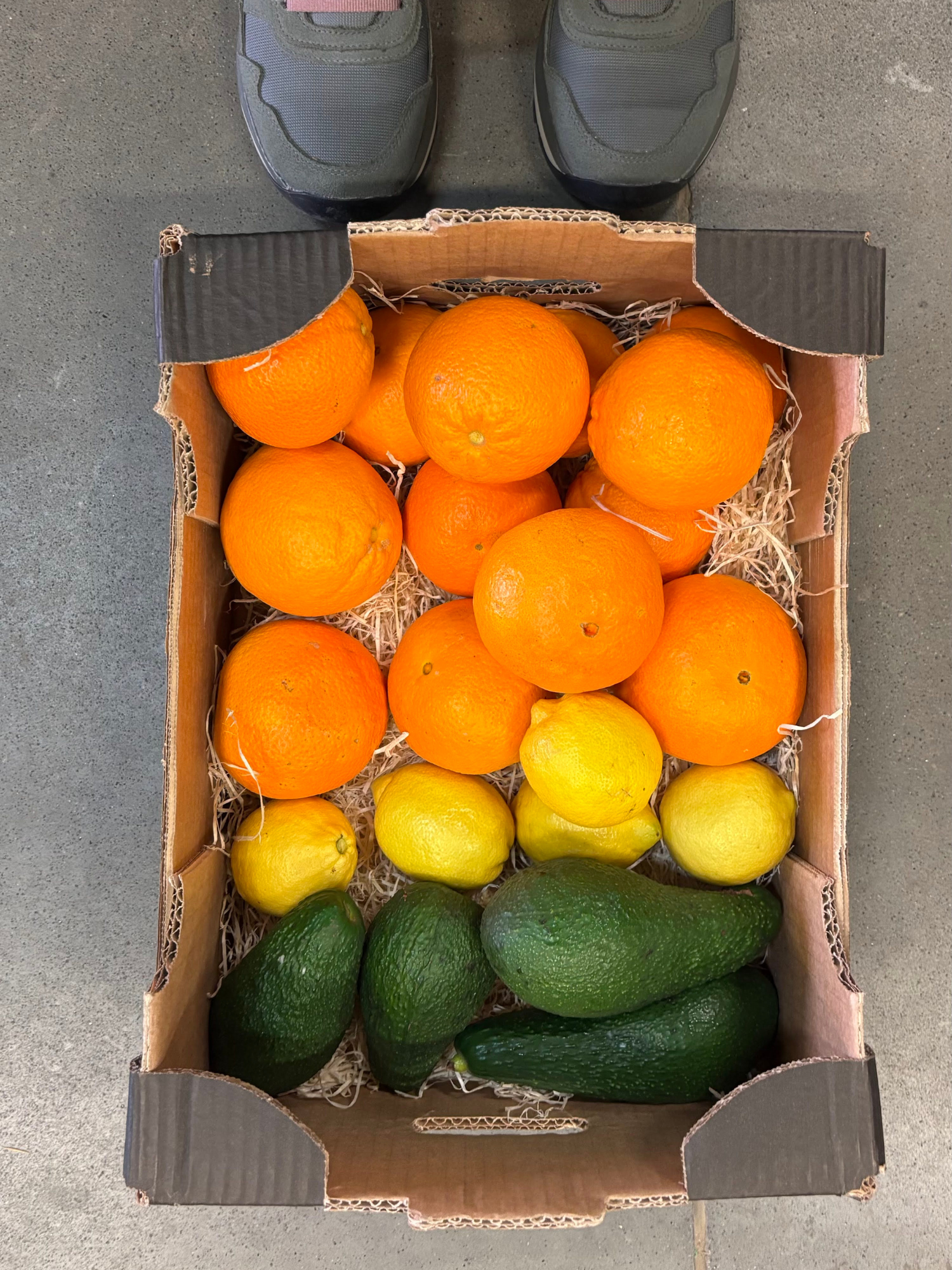 10 – 13 pomeranč, 5 citrón, 3-4 avokádo. Celková váha 3-3,5 kg podle váhy jednotlivých kusů. Každou bedýnku skládáme podle aktuální dostupnosti a zralosti ovoce.